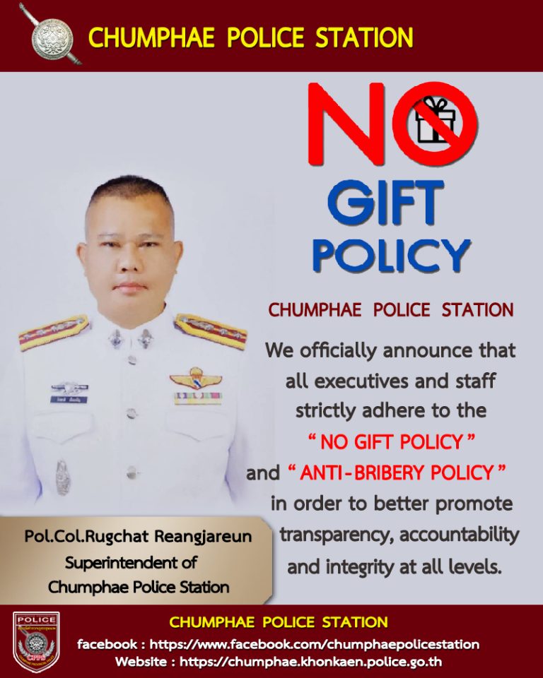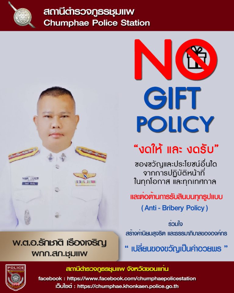 - ประกาศสำนักงานยุทธศาสตร์ตำรวจเรื่องเจตนารมณ์ที่จะไม่รับของขวัญหรือของกำนัลทุกชนิดจากการปฏิบัติหน้าที่
