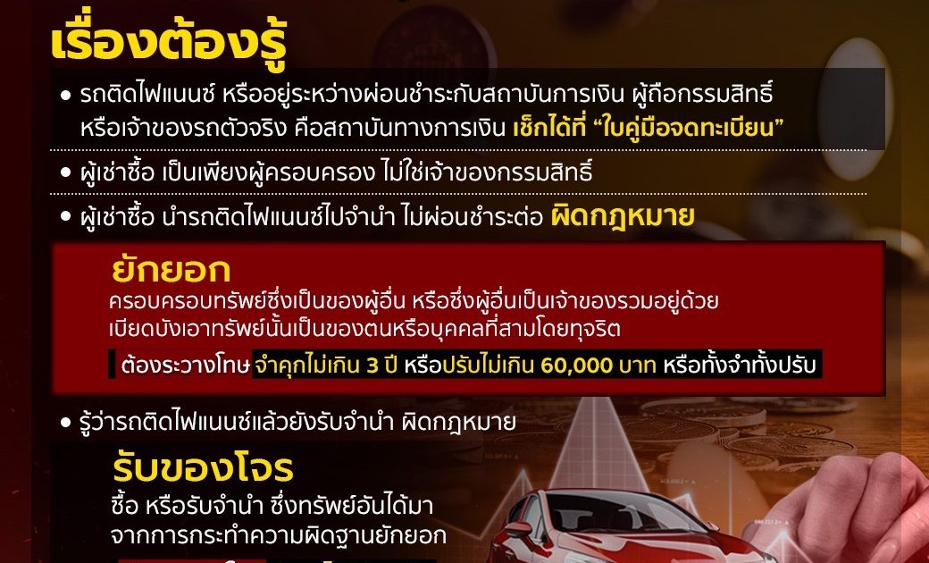 ดังนั้น การที่ผู้เช่าซื้อนำรถติดไฟแนนซ์ไปจำนำ แล้วผู้เช่าซื้อไม่ผ่อนชำระหรือไม่นำเงินมาปิดยอดไฟแนนซ์ที่เหลืออยู่ จะเข้าข่ายเป็นการ “ครอบครอบทรัพย์ซึ่งเป็นของผู้อื่นหรือซึ่งผู้อื่นเป็นเจ้าของรวมอยู่ด้วย เบียดบังเอาทรัพย์นั้นเป็นของตนหรือบุคคลที่สามโดยทุจริต” ซึ่งเป็นความผิดฐาน “ยักยอก” ต้องระวางโทษจำคุกไม่เกิน 3 ปี หรือปรับไม่เกิน 60,000 บาท หรือทั้งจำทั้งปรับ