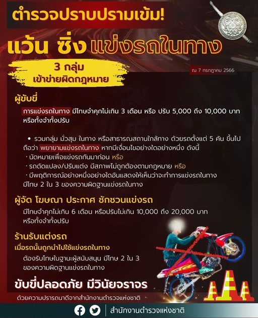 ผู้ขับขี่แข่งรถในทาง หรือมีพฤติการณ์เข้าข่ายพยายามแข่งรถในทาง ผู้จัด โฆษณา ชักชวน รวมถึงร้านแต่งรถ ดัดแปลงรถเพื่อแข่งรถในทาง ล้วนมีความผิดตามกฎหมาย