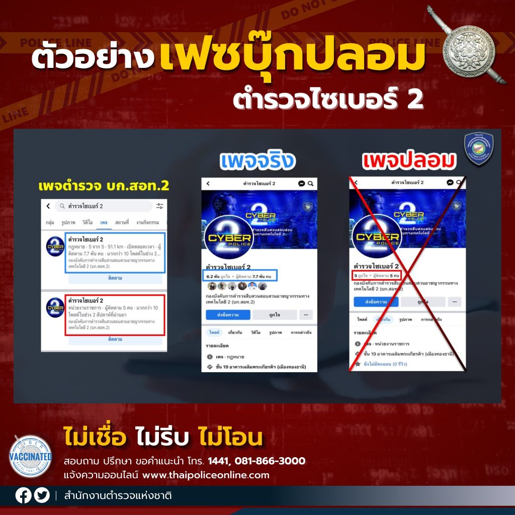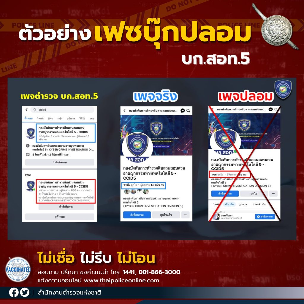 3.เพจเฟซบุ๊กของ บก.สอท.2 คือ “ ตำรวจไซเบอร์ 2 ” มีผู้ติดตามกว่า 7 พันราย สร้างบัญชีเมื่อ 28 ม.ค.64 และเพจเฟซบุ๊กของ บก.สอท.5 คือ “ กองบังคับการตำรวจสืบสวนสอบสวนอาชญากรรมทางเทคโนโลยี 5 – CCID5” มีผู้ติดตามกว่า 1 หมื่นราย สร้างบัญชีเมื่อ 6 พ.ย.63 และหากท่านต้องการที่จะเข้าสู่เพจดังกล่าวขอให้ตรวจสอบให้ดีเสียก่อน