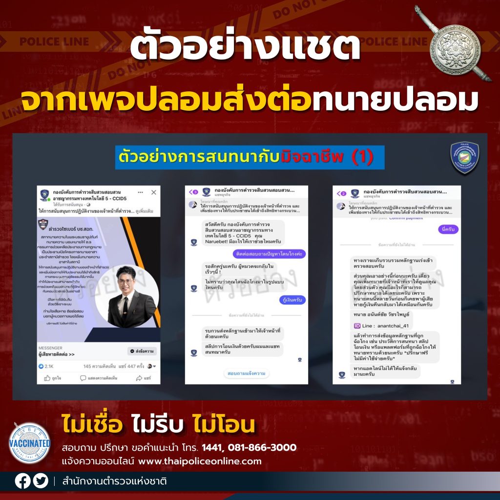 ผู้เสียหายได้ติดต่อไปยังเพจเฟซบุ๊กหน่วยงานในสังกัด บช.สอท. หรือตำรวจไซเบอร์ จำนวน 2 เพจ ได้แก่ 1.เพจที่ใช้ชื่อว่า “ ตำรวจไซเบอร์ 2 ” และ 2.เพจที่ใช้ชื่อว่า “ กองบังคับการตำรวจสืบสวนสอบสวนอาชญากรรมทางเทคโนโลยี 5 – CCID5 ” ซึ่งมิจฉาชีพได้ปลอมขึ้นมา และตั้งชื่อให้เหมือนกับเพจเฟซบุ๊กจริง ใช้การโฆษณาเพื่อเข้าถึงเหยื่อเป้าหมาย หลอกลวงให้ผู้เสียหายที่ไม่ทันได้สังเกตที่ติดต่อเข้ามาแล้วหลอกลวงสอบถามเอาข้อมูลต่างๆ