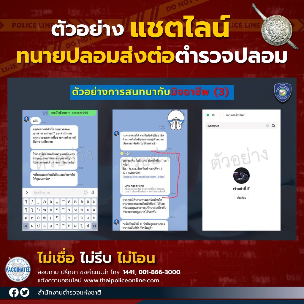 • จากนั้นจะมีการให้เพิ่มเพื่อนทางไลน์เพื่อไปแจ้งรายละเอียดที่เกี่ยวข้องไปยังเจ้าหน้าที่ตำรวจปลอมยศ พ.ต.อ. อ้างว่าเป็นหัวหน้าทีม IT เชี่ยวชาญทางด้านเทคโนโลยี ไอดีไลน์ “ cyber00it ”