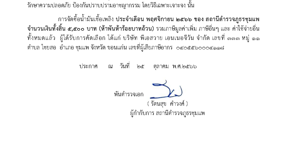 ประกาศจัดซื้อน้ำมันเชื้อเพลิงรถยนต์ตู้โดยสารรถยนต์เอนกประสงค์ เดือน พฤศจิกายน 2566
