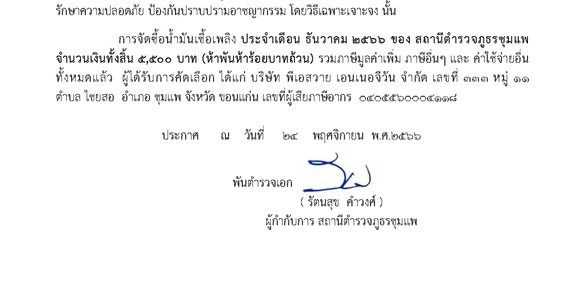 ประกาศจัดซื้อน้ำมันเชื้อเพลิงรถยนต์ตู้โดยสารรถยนต์เอนกประสงค์ เดือน ธันวาคม 2566
