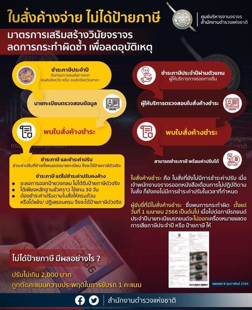 ผู้ขับขี่ที่มีใบสั่งค้างชำระ ซึ่งพบการกระทำผิด ตั้งแต่วันที่ 1 เมษายน 2566 เป็นต้นไป ( ไม่มีผลย้อนหลัง ) เมื่อไปต่อภาษีประจำปี นายทะเบียนจะไม่ออกเครื่องหมายแสดงการเสียภาษีประจำปี หรือ ป้ายภาษี ให้