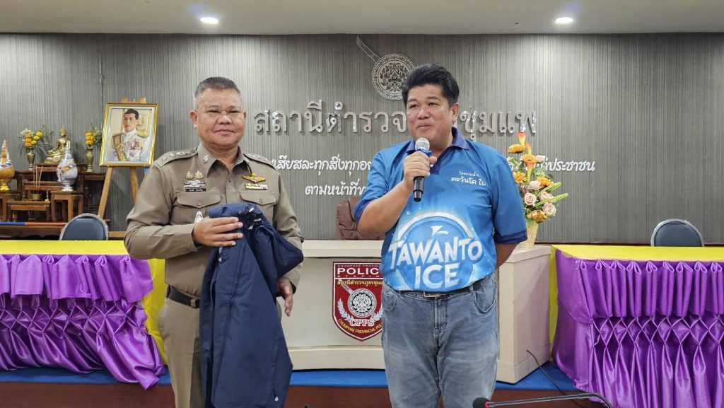 พร้อมนี้ โรงงานน้ำแข็ง ตะวันโต ไอซ์ โดยนายธีณพัฒน์ วีรธนาพงษ์ ได้มอบเสื้อแจ็คเก็ต เพื่อสนับสนุนการปฏิบัติหน้าที่ของเจ้าหน้าที่ตำรวจจราจร ในที่ประชุมครั้งนี้ด้วย