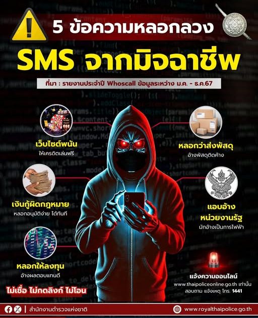 ระวัง 5 ข้อความ SMS ทรงมิจฯ ส่งมาหลอกให้คลิก กดลิงก์ หลอกแชต ลวงให้โอนเงิน 24 เมษายน 2568 โดย แอดมิน / ข่าวประชาสัมพันธ์/เตือนภัยออนไลน์ ระวัง 5 ข้อความ SMS ทรงมิจฯ ส่งมาหลอกให้คลิก กดลิงก์ หลอกแชต ลวงให้โอนเงิน เว็บไซต์พนัน หลอกว่าส่งพัสดุ เงินกู้ผิดกฎหมาย หลอกให้ลงทุน แอบอ้างหน่วยงานรัฐ ข้อความประเภทนี้มักแนบลิ้งก์ จูงใจด้วยข้อความชวนให้ตกใจ สงสัย อยากลุ้น อยากได้ เมื่อเผลอกดลิงก์ จะลวงให้แชต หว่านล้อมหลอกล่อให้โอนเงินให้ หรือให้ร่วมกิจกรรมต่าง ๆ ท้ายที่สุด มิจฯ จะขโมยเงินในบัญชี ขโมยข้อมูล  #ไม่เชื่อไม่กดลิงก์ไม่โอน ขอบคุณข้อมูล : Whoscall #เตือนภัยออนไลน์ #สำนักงานตำรวจแห่งชาติ #Royalthaipolice Post Views: 38 FacebookFacebookXXLINELine