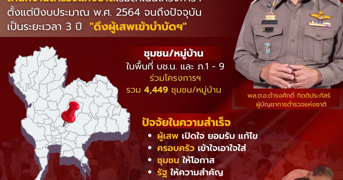 ตลอด 3 ปี นับแต่เริ่มโครงการฯ ตำรวจเดินหน้าเชิงรุก ดึงชุมชน / หมู่บ้าน ร่วมโครงการฯ 4,449 แห่ง ค้นหาผู้เสพเข้ารับการบำบัดกับโครงการฯ 52,209 คน โดยปัจจัยความสำเร็จ คือ ผู้เสพ ครอบครัว ชุมชน ภาครัฐ และการปราบปรามอย่างจริงจัง สร้างเครือข่ายในชุมชน