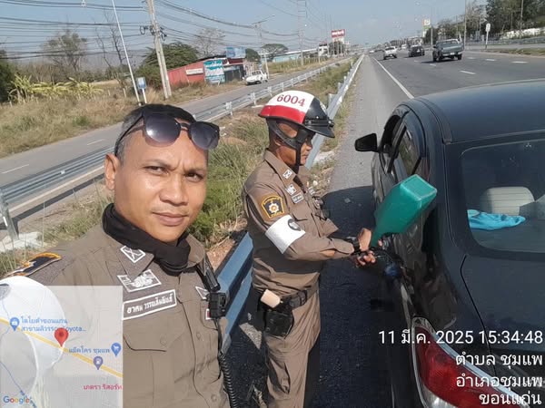 เจ้าหน้าที่ตำรวจจราจรสภ.ชุมแพ ปฏิบัติหน้าที่งานจราจร ช่วยเหลือประชาชนรถยนต์น้ำมันหมด บริเวณถนนมลิวรรณ ตรงข้ามบริษัท แลคตาซอย ก่อนถึงแม็คโคร สามารถเดินทางไปต่อได้