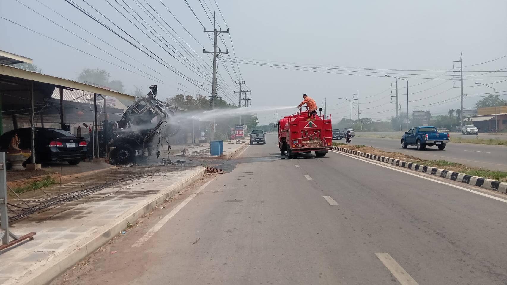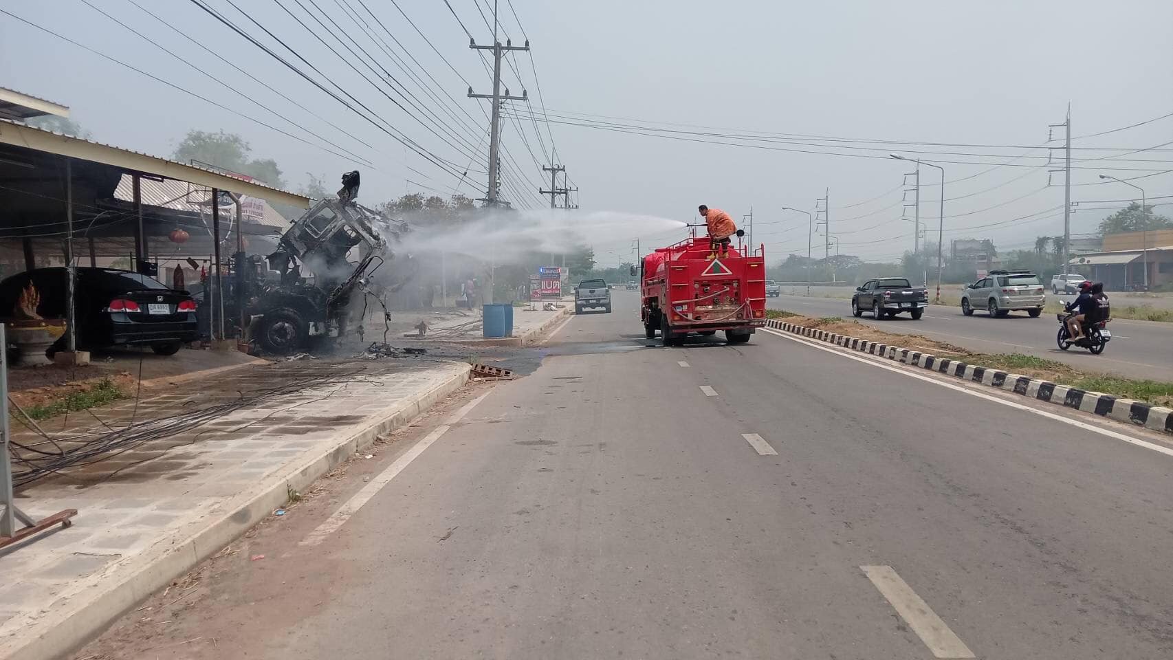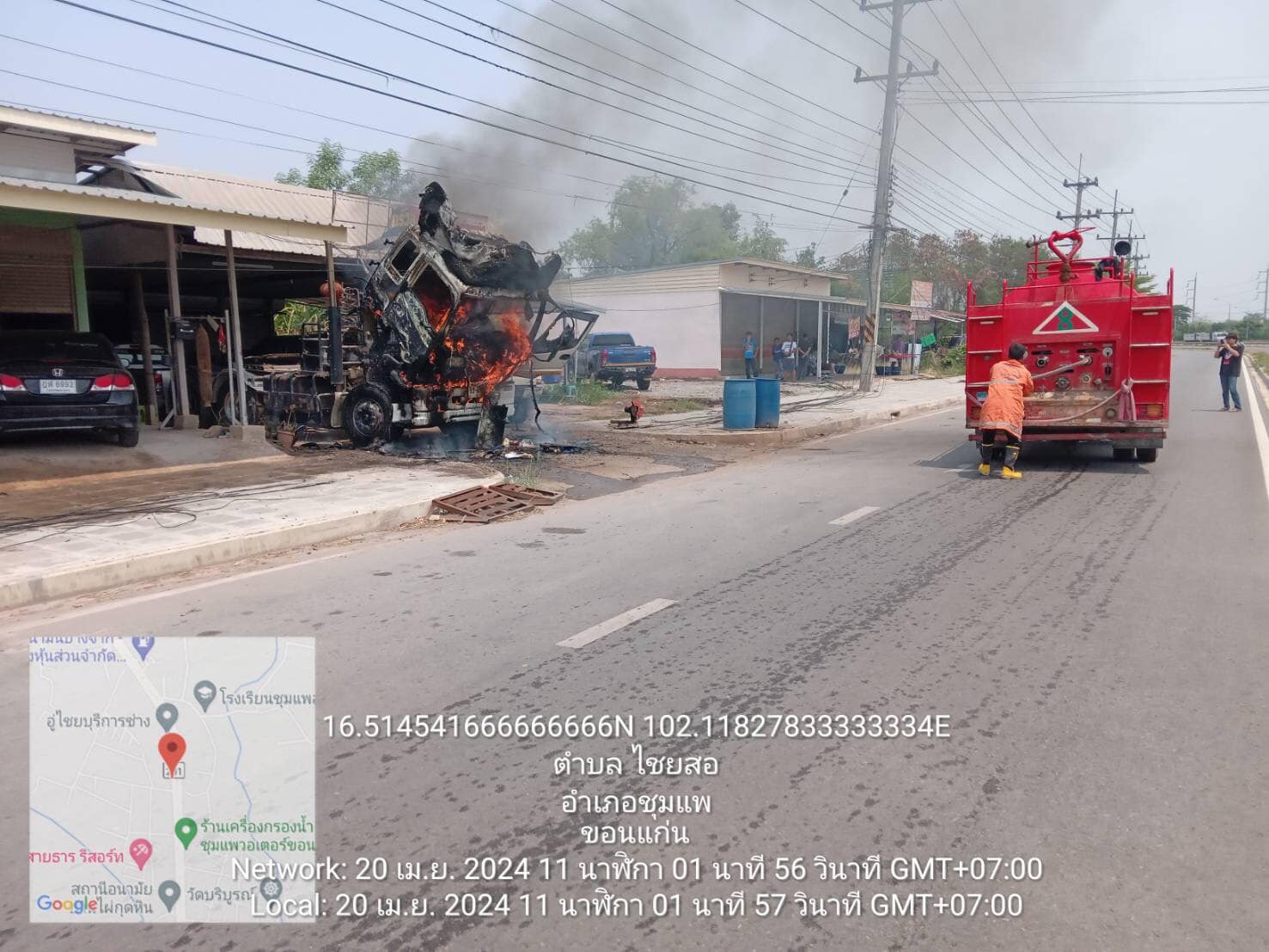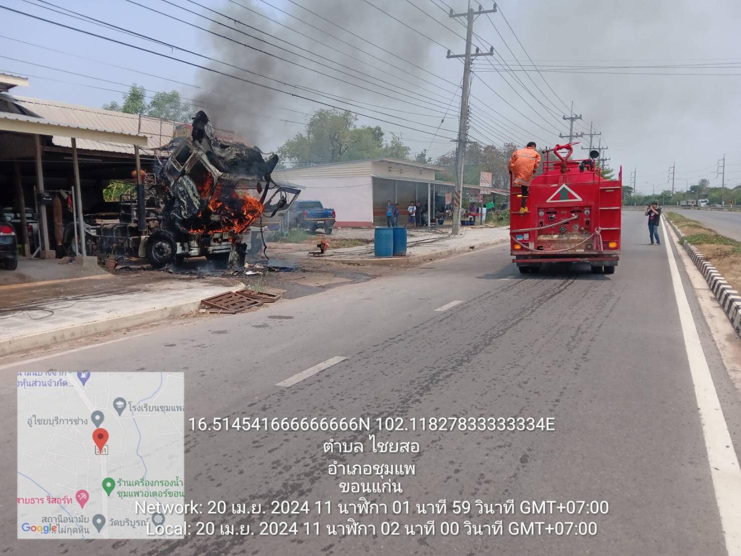 วันที่ 20 เมษายน 2567 เวลาประมาณ 11.00 น. สภ.ชุมแพ ได้รับแจ้งมีเหตุไฟไหม้หัวรถบรรทุก บริเวณชุมชนไผ่กุดหิน 2 ขาเข้าโลตัสชุมแพ ถ.ชุมแพ-ภูเขียว ร.ต.อ.ประเวก พรมรอด รอง สวป.สภ.ชุมแพ (ชุมแพ 60) พร้อมด้วยเจ้าหน้าที่จราจร ออกตรวจสอบที่เกิดเหตุ และอำนวยความสะดวกการจราจร ดับไฟเรียบร้อย..เหตุการณ์ปกติ