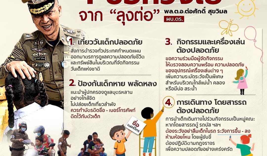 พ.ต.อ.หญิง ฉันฉาย รัตนพานิช รองโฆษกสำนักงานตำรวจแห่งชาติ เปิดเผยว่า พล.ต.อ.ต่อศักดิ์ สุขวิมล ผู้บัญชาการตำรวจแห่งชาติ มีความห่วงใยและคำนึงถึงความปลอดภัยของเด็กและเยาวชน โดยเฉพาะปัญหาเด็กหาย เด็กพลัดหลงกับบิดา-มารดา หรือผู้ปกครอง และการเกิดอุบัติเหตุต่างๆ จึงสั่งการให้ตำรวจ