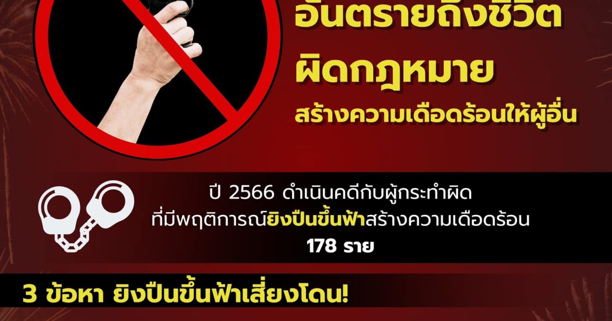 เมื่อวันที่ 30 ธันวาคม 2566 พ.ต.อ.หญิง ฉันฉาย รัตนพานิช รองโฆษกสำนักงานตำรวจแห่งชาติ เปิดเผยว่า พล.ต.อ.ต่อศักดิ์ สุขวิมล ผู้บัญชาการตำรวจแห่งชาติ ( ผบ.ตร. ) มีความกังวลในกรณีที่มีเหตุการณ์สูญเสียชีวิตจากเหตุยิงปืนขึ้นฟ้าเพื่อเฉลิมฉลองส่งท้ายปีเก่า ต้อนรับปีใหม่ 2567 ที่อาจเกิดจากค่านิยมที่ผิด ความคึกคะนอง ขาดสติ รวมถึงความรู้เท่าไม่ถึงการ โดยการยิงปืนขึ้นฟ้าอันตรายเพราะกระสุนปืนที่ยิงออกไปนั้นอาจจะไปตกใส่บุคคลให้ได้รับอันตรายบางรายถึงขั้นเสียชีวิต หรือตกใส่หลังคาบ้านเรือนประชาชนจนได้รับความเสียหาย ซึ่งถือว่าเป็นความผิด และมีโทษตามกฎหมาย