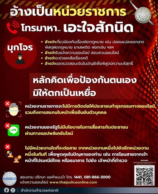 • หน่วยงานราชการจะไม่มีการติดต่อให้ประชาชนทำธุรกรรมทางออนไลน์ รวมถึงการสแกนใบหน้าเพื่อยืนยันตัวบุคคล