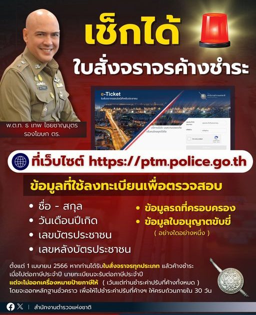 รองโฆษก ตร. กล่าวเพิ่มเติมว่า เพื่อเป็นการอำนวยความสะดวกต่อประชาชน หากผู้ขับขี่ยวดยานพาหนะ ไม่แน่ใจว่าตนเองมีใบสั่งให้ไปชำระค่าปรับหรือมีใบสั่งค้างชำระหรือไม่ สามารถลงทะเบียนใช้งานและตรวจสอบได้ที่เว็บไซต์ https://ptm.police.go.th หรือตู้บริการอเนกประสงค์ภาครัฐ