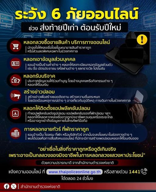 สำนักงานตำรวจแห่งชาติ จึงขอเอาโอกาสนี้มาเตือนพี่น้องประชาชนให้ระมัดระวังตนเอง เพื่อไม่ให้ตกเป็นเหยื่อของกลุ่มมิจฉาชีพ เพราะอย่าลืมว่า แม้จะเป็นวันหยุด แต่มิจฉาชีพไม่เคยหยุด ซึ่งรูปแบบของภัยออนไลน์ที่พี่น้องประชาชนต้องระมัดระวังเป็นพิเศษ ในช่วงส่งท้ายปีเก่าต้อนรับปีใหม่ มีดังนี้