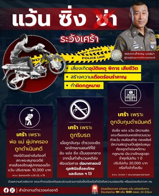 พล.ต.ท.สำราญ ฯ เผย สำนักงานตำรวจแห่งชาติปราบปรามเด็ดขาด เด็กแว้น รถซิ่ง ป่วนเมือง สร้างความเดือดร้อน สกัดเข้ม 3 ทาง สายออกทริปยกล้อต้องระวัง! พร้อมงัด 4 มาตรการ “ขับ – ซ้อน – เชียร์ – ชักชวน – ผู้ปกครอง” โดนแน่ รับโทษหนัก คุก ปรับ ริบรถ