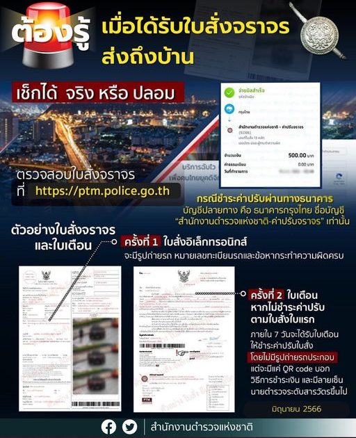 – ครั้งที่สอง เป็นใบเตือนให้ชำระค่าปรับใบสั่ง ซึ่งในเอกสารครั้งที่สองนี้ จะไม่มีรูปถ่ายรถประกอบ แต่จะมีแค่ QR code บอกวิธีการชำระเงิน และ มีลายเซ็นนายตำรวจระดับสารวัตรขึ้นไป เซ็นประกอบ แต่ยืนยันว่า เป็นเอกสารทางราชการจริง