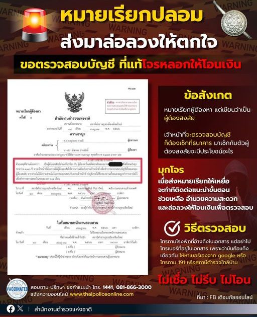 ตัวอย่างหมายเรียกปลอม มิจฉาชีพส่งมาล่อลวงให้ตกใจ อุบายแอบอ้างเป็นเจ้าหน้าที่ฯ หลอกให้โอนเงิน