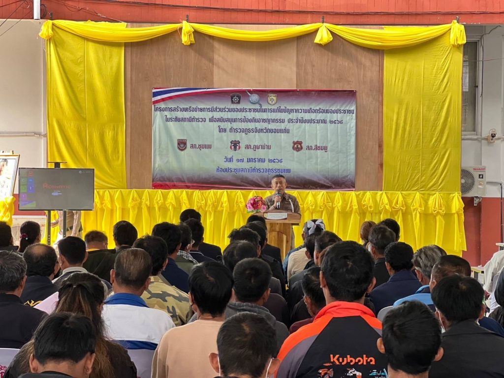 วันที่ 17 ม.ค. 2568 เวลา 09.00 น. พ.ต.อ.คะเชนทร์ ยืนยง รอง ผบก.ภ.จว.ขอนแก่น ได้เดินทางมาเป็นประธานในพิธีเปิดการอบรมโครงการสร้างเครือข่ายการมีส่วนร่วมของประชาชนในการป้องกันอาชญากรรมระดับตำบล ประจำปีงบประมาณ พ.ศ.2568 ณ โรงฝึกยุทธวิธี สภ.ชุมแพ โดยมีผู้เข้ารับการอบรมเป็นผู้นำชุมชนและประชาชนในพื้นที่ สภ.ชุมแพ, สภ.สีชมพู, สภ.ภูผาม่าน เข้ารับการอบรม สภ.ละ 50 คน รวมจำนวน 150 คน