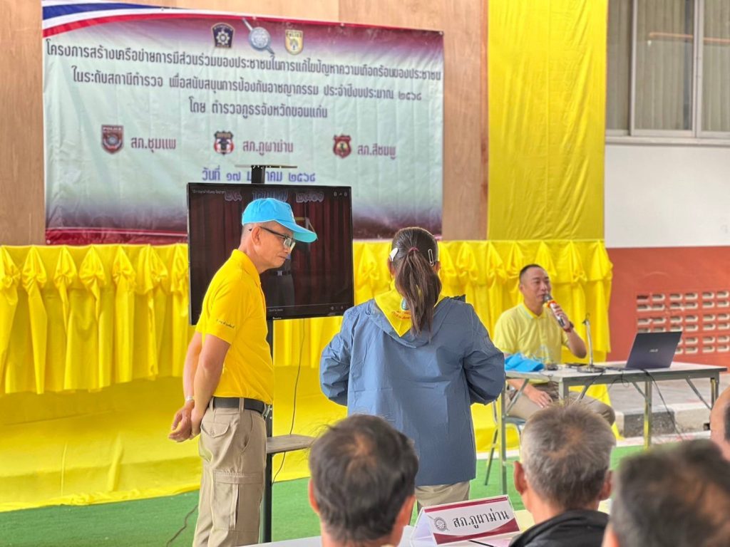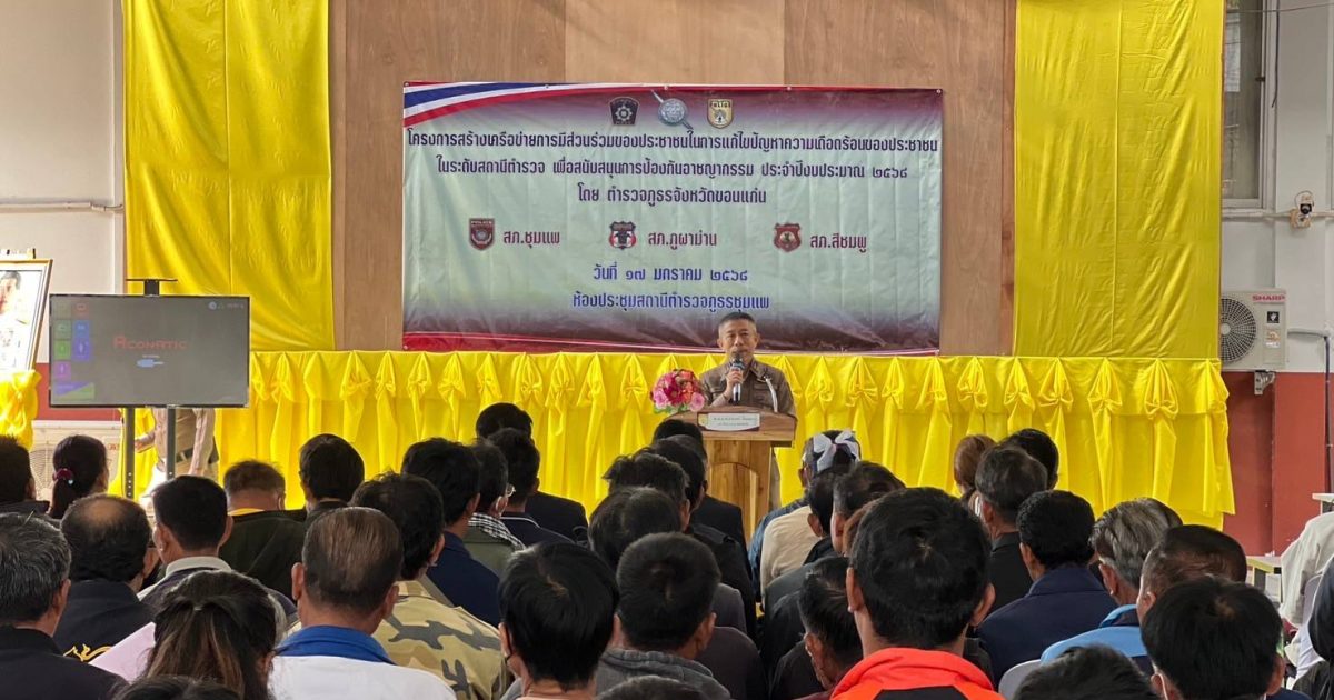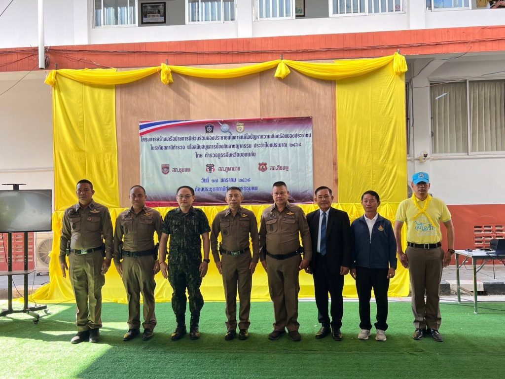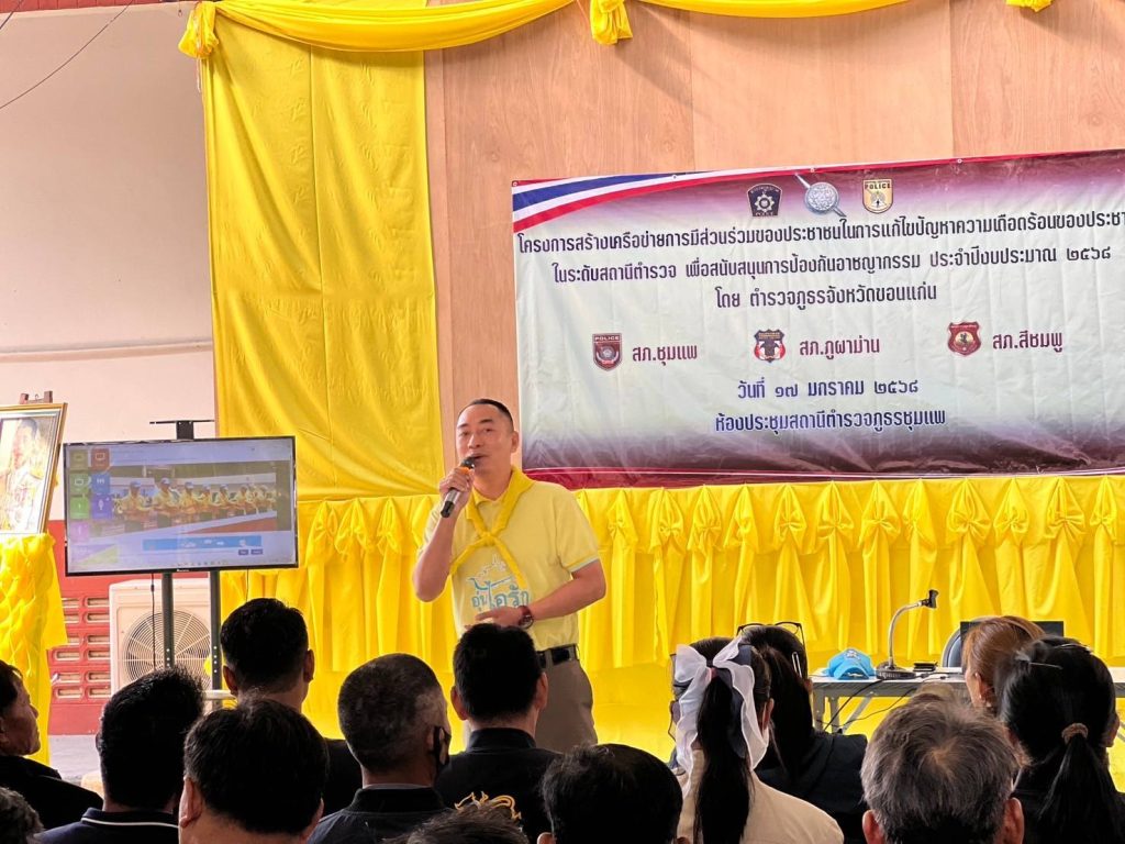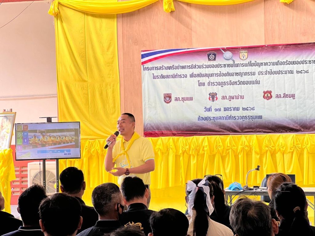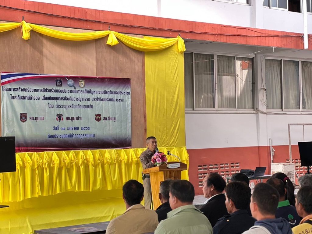 วันที่ 17 ม.ค. 2568 เวลา 09.00 น. พ.ต.อ.คะเชนทร์ ยืนยง รอง ผบก.ภ.จว.ขอนแก่น ได้เดินทางมาเป็นประธานในพิธีเปิดการอบรมโครงการสร้างเครือข่ายการมีส่วนร่วมของประชาชนในการป้องกันอาชญากรรมระดับตำบล ประจำปีงบประมาณ พ.ศ.2568 ณ โรงฝึกยุทธวิธี สภ.ชุมแพ โดยมีผู้เข้ารับการอบรมเป็นผู้นำชุมชนและประชาชนในพื้นที่ สภ.ชุมแพ, สภ.สีชมพู, สภ.ภูผาม่าน เข้ารับการอบรม สภ.ละ 50 คน รวมจำนวน 150 คน