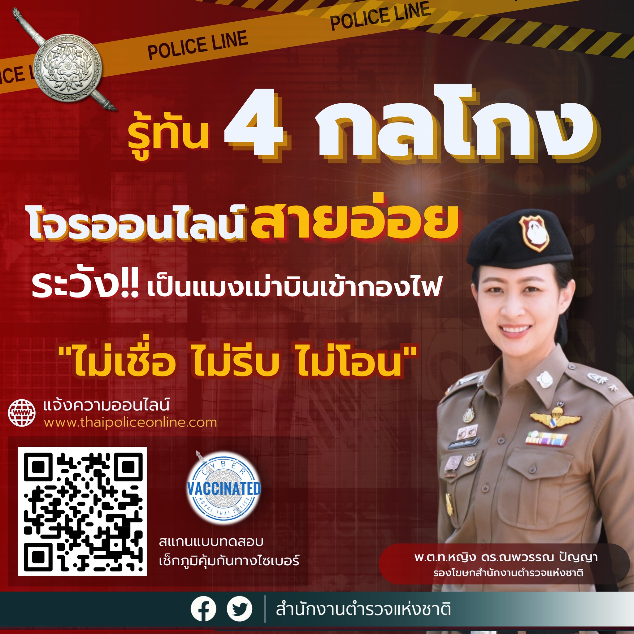 แฉกลโกง “โจรออนไลน์สายอ่อย” ย้ำประชาชนอย่าเป็น “แมงเม่าบินเข้ากองไฟ” เผยสถิติแจ้งความคดีออนไลน์ยังคงสูง เชิญชวนเสริมสร้างภูมิคุ้มกันผ่านแบบทดสอบ “ไซเบอร์วัคซีน”