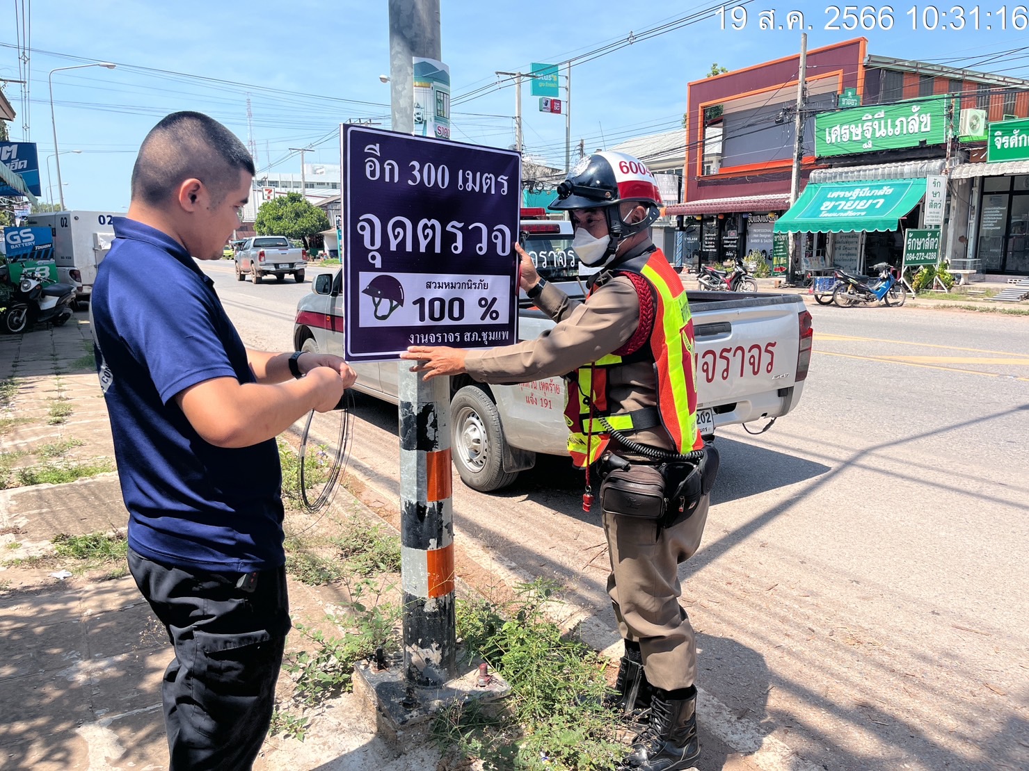 สายตรวจชุดจราจร สภ.ชุมแพ ติดป้ายประชาสัมพันธ์ ขับเคลื่อนวาระ “จังหวัดขอนแก่นขับขี่ปลอดภัย 365 วัน”
