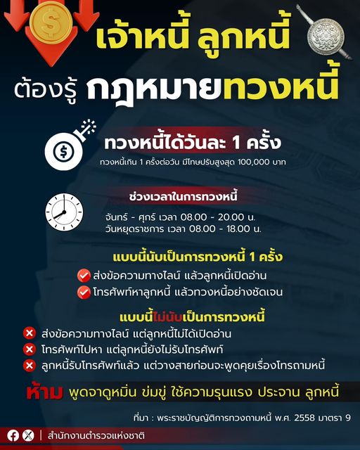 ตามพระราชบัญญัติการทวงถามหนี้ พ.ศ. 2558 ทวงหนี้ได้วันละ 1 ครั้ง หากทวงหนี้เกิน 1 ครั้งต่อวัน มีโทษปร