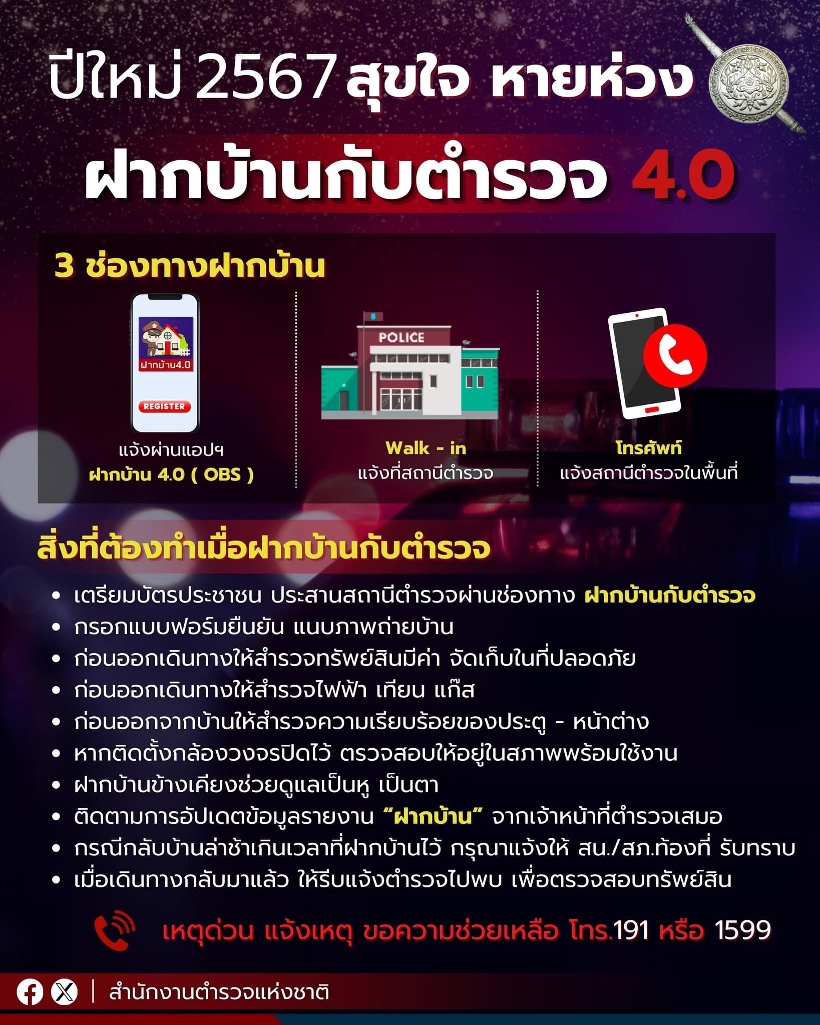 ปีใหม่ 2567 สุขใจ หายห่วง ฝากบ้านไว้ให้ตำรวจช่วยดูแล 3 ช่องทางฝากบ้านกับตำรวจ 📱แจ้งผ่านแอปพลิเคชัน ฝ