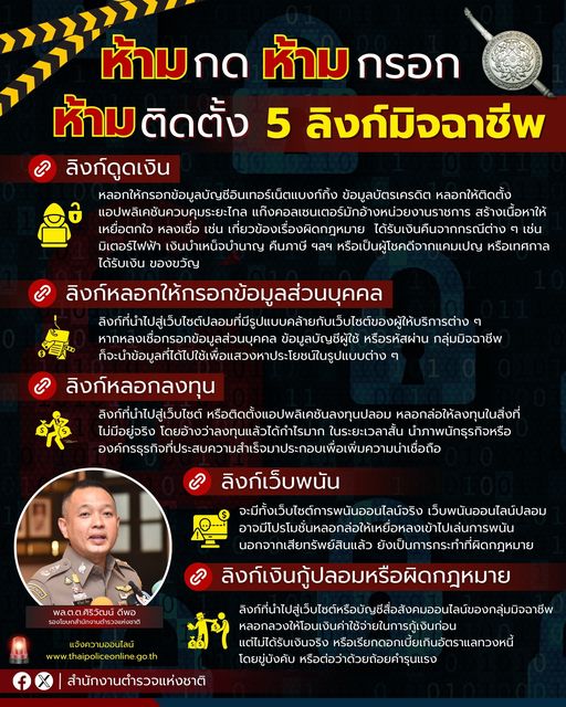 5 ลิงก์มิจฉาชีพ อันตรายหลอกดูดเงิน ล้วงข้อมูล พล.ต.ต.ศิริวัฒน์ ดีพอ รองโฆษกสำนักงานตำรวจแห่งชาติ เตื