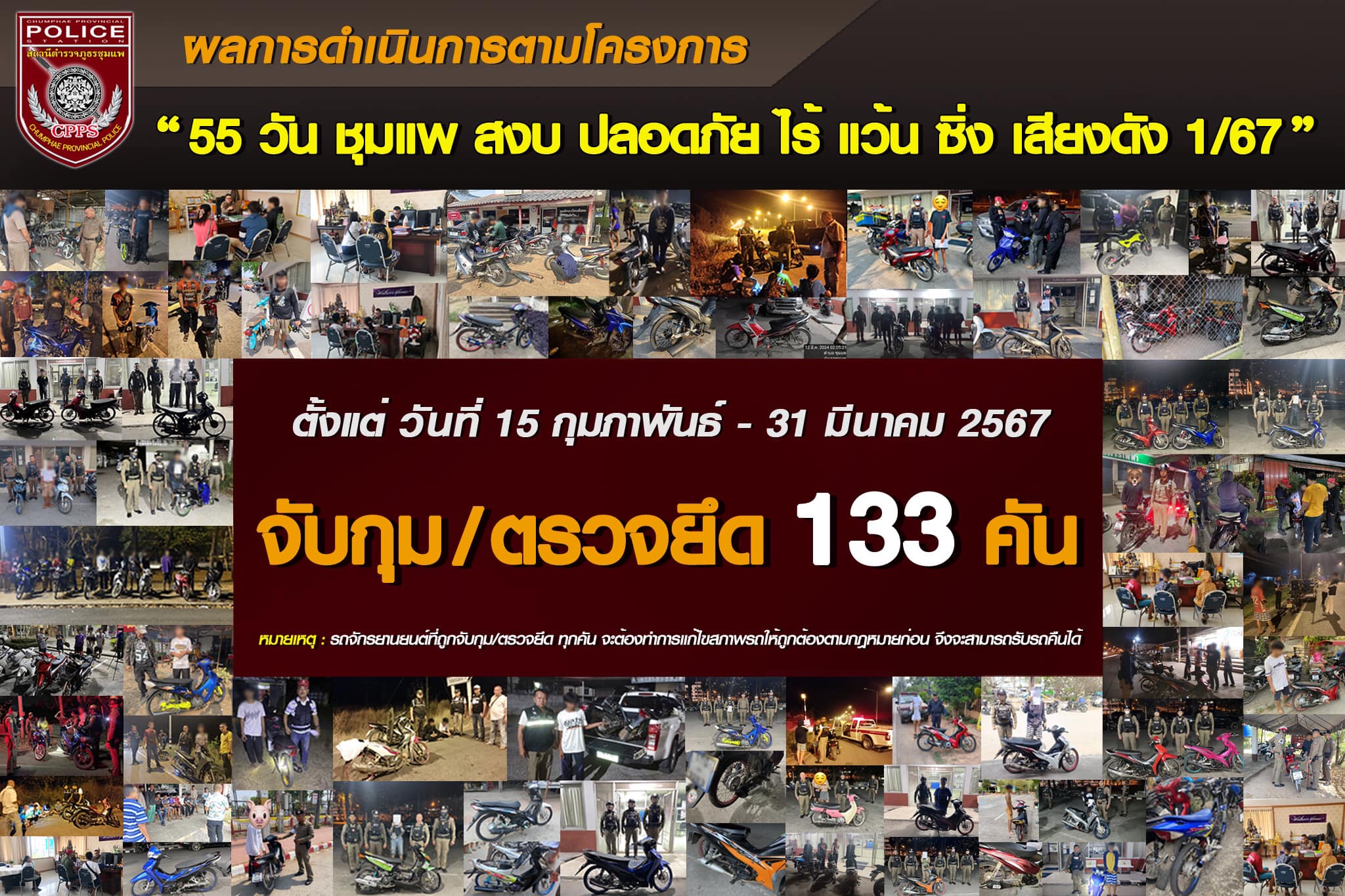 ผลการดำเนินการตามโครงการ “55 วัน ชุมแพ สงบ ปลอดภัย ไร้ แว้น ซิ่ง เสียงดัง 1/67” ตั้งแต่ว