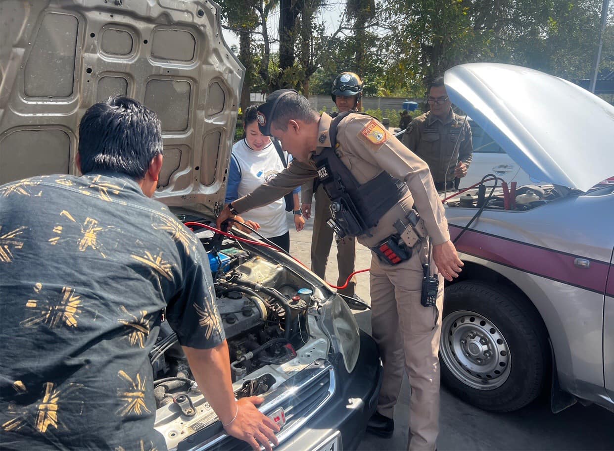 สายตรวจรถยนต์ ช่วยเหลือประชาชนสตาร์ทไม่ติด โดยพ่วงแบตเตอรรี่