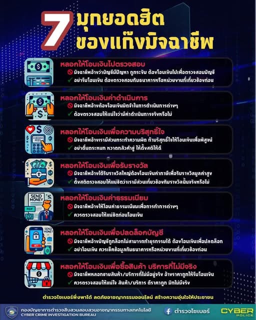 1.หลอกให้โอนเงินไปตรวจสอบ 2.หลอกให้โอนเงินค่าดำเนินการ 3.หลอกให้โอนเงินเพื่อความบริสุทธิ์ใจ 4.หลอกให