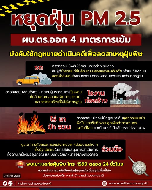 ผบ.ตร. ออก 4 มาตรการบังคับใช้กฎหมาย ดำเนินคดีเข้ม เพื่อลดสาเหตุการเกิดฝุ่นละออง PM 2.5 . พล.ต.อ.กิตต