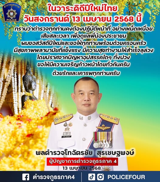 “ สวัสดีปีใหม่ สุขสันต์วันสงกรานต์ ขอให้พี่น้องประชาชนและข้าราชการตำรวจทุกท่าน พร้อมด้วยครอบครัว มีค