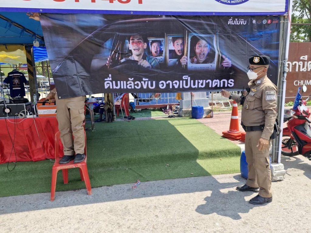 พร้อมด้วยสายตรวจจราจร ติดตั้งป้ายรณรงค์ ดื่มไม่ขับบริเวณหน้า สภ.ชุมแพ
