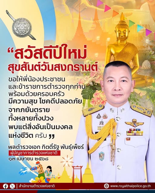 “ สวัสดีปีใหม่ สุขสันต์วันสงกรานต์ ขอให้พี่น้องประชาชนและข้าราชการตำรวจทุกท่าน พร้อมด้วยครอบครัว มีค