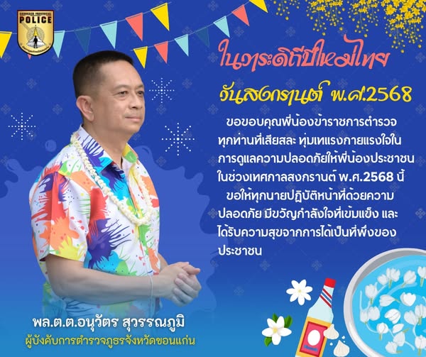 สวัสดีปีใหม่ไทย 2568 เนื่องในเทศกาลสงกรานต์ พล.ต.ต.อนุวัตร สุวรรณภูมิ ผู้บังคับการตำรวจภูธรจังหวัดขอ